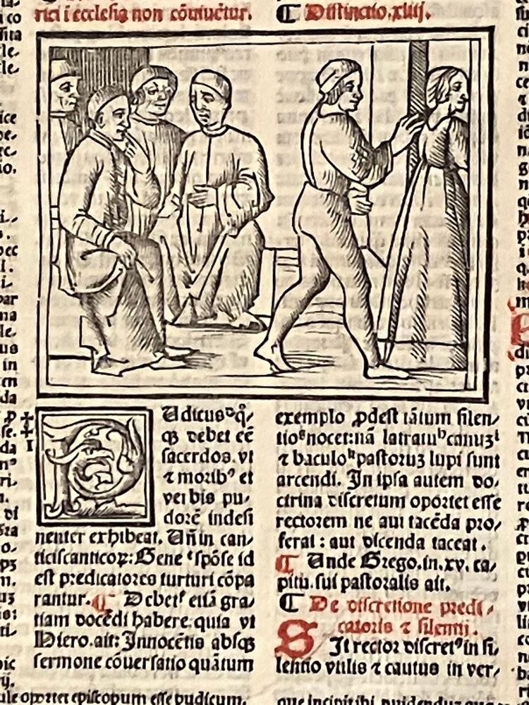 Typographically beautiful edition of Gratianus’ Decretum by the Venetian printer Luca Antonio Giunta the elder. The text is printed mirroring the manuscript editions of the Decretum with the text surrounded by the commentators’ glosses and illustrated by more than 130 woodcuts. The Concordia Discordantia Canonum, or Decretum Gratiani, is a collection of canon law compiled and written in the 12th century as a legal textbook by the jurist and Camaldolese monk known as Gratian. Together with later legal texts (The “Decretals” of Gregory IX; those of Boniface VIII (Sixth Book of the Decretals); those of Clement V (Clementinæ), the Extravagantes of John XXII, and the Extravagantes Communes) it constituted for century the cornerstone of the Corpus Juris Canonici, the main source of the canon law of the Catholic Church, in force until 1917. In addition to the Glossa Ordinaria of Joannes Teutonicus and the glosses of Bartolomeo da Brescia this edition includes the Flos Decreti of Johannes Hispanus, a set of commentaries on Gratian, and the Margarita Decreti of Polonus Martinus, a collection of excerpts from the Decretals of Gregory IX. A complete work (and bibliographically distinct), it is part of a three-volume edition of the Corpus Juris Canonici issued by Giunta in 1514.