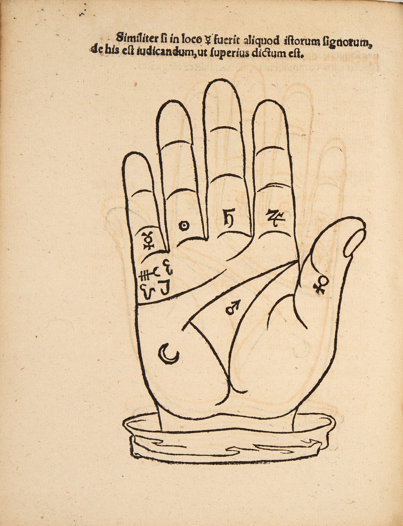 Octavo (20 x 15,5 cm); carte 10, 128, con 71 xilografie chiromantiche nel testo, cornice xilografica al frontespizio, iniziali. Arrossarute e piccoli difetti. Fascicolo A allentato, leggeri aloni marginali. Rilegato con foglio manoscritto rubricato di graduale del XV secolo.